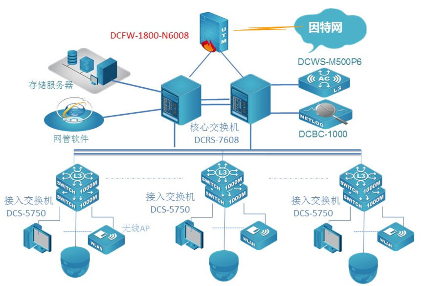 中国江苏白马农业会展中心数据网核心采用两台美高梅美高新一代全分布式架构的核心路由交换机DCRS-7608E,顺利获得VSF功能实现核心冗余和负载分摊;该设备具备强大的业务自适应能力,支持网络平滑升级和策略灵活调度,实现业务快速部署,从而构建业务定义的网络。网络出口采用具有高度集成化的多核安全防火墙,给予包括路由器,防火墙,VPN网关,等功能在内的一体化设备,该设备8Gbps的吞吐量完全满足了园区网对出口的要求。接入交换机采用美高梅美高全千兆24口接入交换机DCRS-5750E,实现客户端千兆接入,万兆上联核心。POE交换机全部采用三层交换机DCRS-5750-28P-P全千兆POE交换机。采用8200双频无线AP使用办公区无线覆盖。展厅和会议室采用高密度AP8200-I3实现展厅高密度覆盖,室外采用8200室外AP实现无线覆盖,无线网络顺利获得一台DCWS6000-M500P6控制器集中管理无线网络。出口部署一台DCBC上网行为审计设备,实现上网行为安全审计。