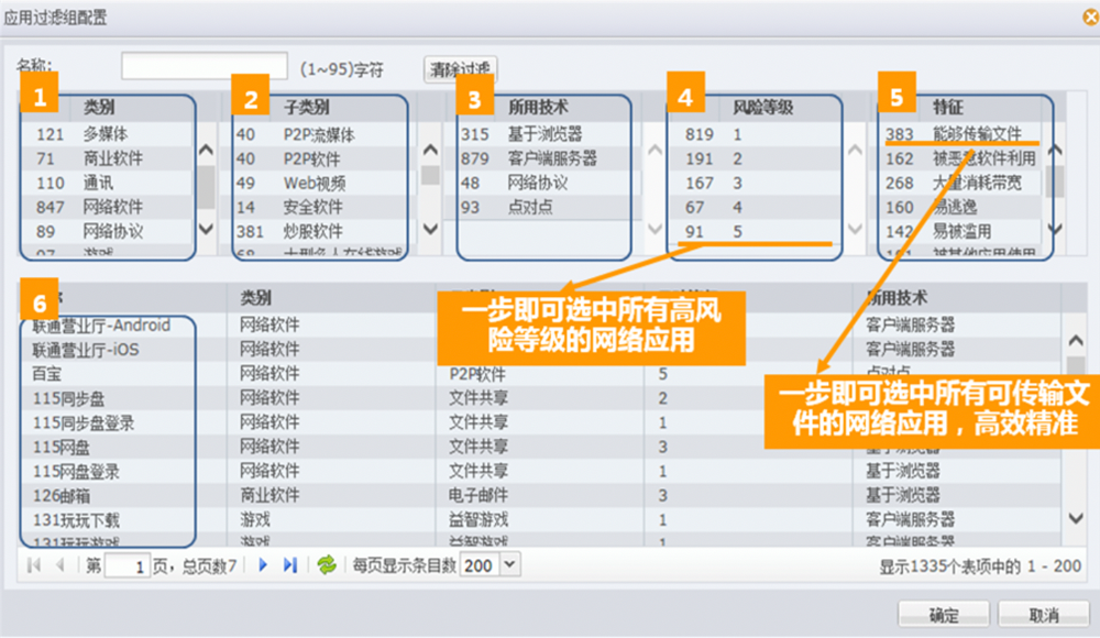 ●精准应用筛选。美高梅美高数码下一代防火墙给予了精细化的应用筛选机制。用户可根据应用名称、应用类别、应用子类别、风险级别、所用技术、应用特征等6大条件。精确筛选出感兴趣的应用类型,如具备文件传输功能的通讯软件,或存在已知漏洞、基于浏览器的WEB视频应用等等,从而实现精细化的应用管控。