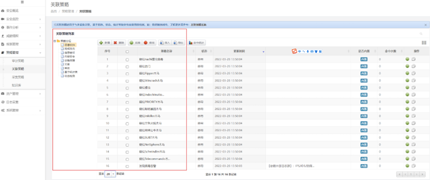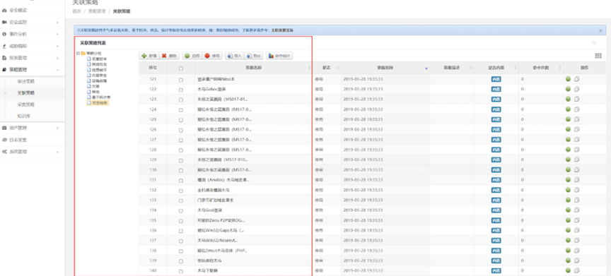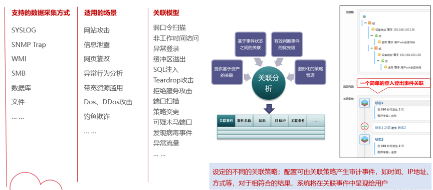 检验日审功能的另一个试金石是关联分析能力。针对日志自动化、集中度、关联度不够的问题,美高梅美高数码DCSSA日志审计系统支持基于规则、统计、情报的分析模型,内置丰富的安全策略模板、高效的实时关联分析能力、灵活的审计策略,充分发挥日志分析及审计机制的最大效力。帮用户实现对日志的关联性处理,让用户能有效处理纷杂无序的日志信息。